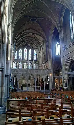Pearson's design is a plain red brick exterior with two turrets at the west end which Pevsner describes as "typically Pearsonian". The 160-foot (49 m)-long church is cruciform, and the south transept was originally designed to carry a 208-foot (63 m)-high tower, which has yet to be completed.[4] Above the nave is a tall clerestory.[5]