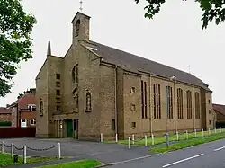 Local Catholics purchased a site in Newby in 1930, with the intention of building a church. Progress was slow, partly due to World War II, and in 1949 a former British Army building was erected, to serve as a mass centre. Between 1958 and 1960, a church was built on the site, to a design by Francis Johnson. The building cost about £35,000 and on completion, it was given its own parish. It was extended in 1970, with the addition of a further chapel, while in 1993 the baptistery was converted into a chapel of remembrance. The building was grade II listed in 2007. Historic England praises the west front, its design inspired by the work of Enrico Del Debbio and Grundtvig's Church in Copenhagen.[1][2]