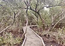 St Kilda is sited on a mangrove forest that borders Barker Inlet, part of the largest tidal estuary of Gulf St Vincent. Late in the 19th century, embankments were constructed through the mangroves to reclaim land for pasture. Subsequently, once the banks of the adjacent saltfields had been built, maintenance of the embankments ceased and the mangroves began to reclaim them. On one of the embankments is the Interpretative Centre, which gives insights into the flora, fauna and processes within the mangrove forest. From there, a 1.7 kilometres (1.1 mi) trail begins through a flooded mangrove forest, most of it on an elevated boardwalk.[4]: 28–29 [note 4] The trail meanders through tidal samphire saltmarsh flats, mangroves and seagrass channels to a lookout that provides elevated views across the Barker Inlet.[23]