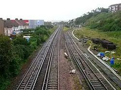 Site of West Marina Station in the distance. The right hand track curves around the remains of the down platform.