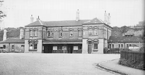 The stations' importance fell after the 1921 grouping, although it retained a certain importance until the late 1950s as a locomotive depot.[3] Following electrification of the East Coastway line in 1935 by the Southern Railway, the service pattern introduced from May saw express trains from London Victoria call at all stations except West Marina.[27] Nevertheless, the station became the terminus for London services in November 1949 when it was necessary to close Bopeep Tunnel for repairs; buses ferried passengers from West Marina to St Leonards Warrior Square.[28][29] Normal services through the tunnel resumed on 5 June 1950.[28] Remarkably the now dilapidated station remained open to passengers until 10 July 1967,[6][22][19][30] the station's goods yard already having closed on 26 November 1962.[31] For several years after closure the station platforms remained available for use of railway staff requiring access to the depot.