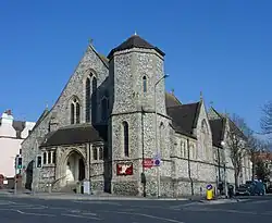Queen's Park was laid out as an ornamental park of 15.3 acres (6.2 ha) in 1824. Charles Barry was hired to design decorative entrances and a villa for the park's owner.[1][2] Housing development around the park had started in the 1810s and continued throughout the 19th century.[1] The first Anglican place of worship in the area was built in 1875 and became a chapel of ease to St Mary's Church in Kemptown when that church was completed. The red-brick building was on the west side of Queen's Park Road.[1][3] In 1880 a separate parish was established, and preparatory work on the new church started the following year on the opposite side of the road.[3] The site was bought for £900; the foundation stone was laid in 1882 by the Bishop of Chichester, Richard Durnford;[4] and Arthur Blomfield finished the church in 1885, apart from a proposed spire which was never built because of a lack of money.[1] The new St Luke's Church was consecrated on 16 April 1885.[4] The 1875 building held services until then;[1] it then became the church hall until it was gutted by fire and demolished in the 1970s, after which flats were built on the site.[1][3]