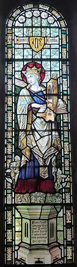A stained glass window from 1908 commemorates St Cecilia, gifted by survivors of William Henry Foster, as inscribed in the dedication. Unusually, it shows lady's slipper orchids (Cypripedium calceolus) at her feet.