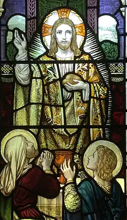 The East window, Christ in Majesty, is by Clayton & Bell. On the south side there are two further two light Clayton and Bell windows (1891) showing a) Mary Magdalene washing Christ's feet, b) Noli Me Tangere, and c) the Publican and the Pharisees. The window immediately on the east of the main door on the south wall is a two light window by James Powell and Sons. It portrays The Supper at Emmaus and Christ baptising.[27]