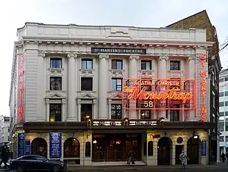 After Cochran, Bertie Meyer ran the theatre intermittently until 1967, when his son R. A. (Ricky) Meyer became administrator for the next two decades. The St Martin's has been listed Grade II on the National Heritage List for England since March 1973.[4] In March 1974 Agatha Christie's The Mousetrap transferred from the Ambassadors to the St Martin's, where it continued its run until 16 March 2020 when the show had to be suspended due to the COVID-19 pandemic in the United Kingdom, holding the record for the longest continuously running show in the world. On 17 May 2021, the show was the first West End show to re-open[5] and as of February 2024 has exceeded 29,500 performances at the St Martin's.