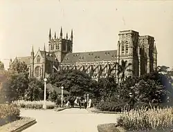 Archbishop Polding laid the foundation stone for the present cathedral in 1868.[7] It was to be a huge and ambitious structure with a wide nave and aisle and three towers. Polding did not live to see it in use as he died in 1877. Five years later, on 8 September 1882, his successor, Archbishop Vaughan, presided at the dedication Mass. Archbishop Vaughan gave the peal of bells which were rung for the first time on that day. Vaughan died while in England in 1883.