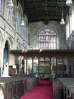 The nave and chancel are divided from the aisles by seven-bay arcades, the piers being without capitals. At the top of each pier, facing the nave, is a carved human face. The roofs are divided into panels and contain much carving, including bosses (protrusions), shields, inscriptions and three pendants.[4] The chapel at the west end of the south aisle is known as the Lady Chapel, and that on the north side is dedicated to Saint Mary.[1][4] The church contains more medieval fittings and furniture than any other Cheshire church.[2] Between the nave and the chancel is a screen, and there are parclose screens between the aisles and the chapels.[2] The chancel screen, dated 1500, is elaborately carved with representations of birds, roses, vines and foliage. It has ten bays with lierne vaulting. The chancel stalls and the carved wooden eagle lectern date from around the same period.[2] The lectern is one of the oldest eagle lecterns in the United Kingdom.[7] The stalls have hinged seats, and formerly had misericords (shelves to support a standing person).[4] Much of the furniture dates from the 17th century and is in Jacobean style. This includes the altar rails, the octagonal pulpit, the box pews, the reredos (screen behind the altar) in the Lady Chapel, and the font cover.[1][2] The font itself is Perpendicular.[4] The reredos in the chancel of 1866 was designed by the Manchester architect J. S. Crowther.[1]