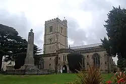 A World War I memorial is located in the churchyard. An obelisk with Perpendicular decorations, it has been Grade II Listed since 1983.[7] It lists the names of 65 local men who lost their lives in the war, with a later addition of 19 names from World War II.[8] An early 19th-century tomb chest, located by the churchyard's north east gate, is also Grade II Listed.[9]