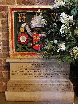 - Nicholas West (1461 – 28 April 1533), bishop and diplomat, was born at Putney, and educated at Eton and at King's College, Cambridge, of which he became a fellow in 1486. He built two chapels, one in St. Mary's and the other in Ely Cathedral, where he is buried.