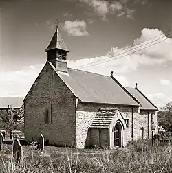 The church is built of limestone with a Welsh slate roof, and consists of a nave, a south porch, and a chancel. On the west gable end is a wooden bellcote. The porch contains a round-arched doorway with two moulded orders on colonnettes with scalloped capitals, and above it is a beaded hood mould. Inside, there is a niche to the left of the altar with a trough and two columns, probably a lavatorium which may have been brought from elsewhere. To the right of the altar is an aumbry, piscina and sedile. There is a round font which may be Norman but has a later base and a 17th-century octagonal wooden cover.[1][2][3]