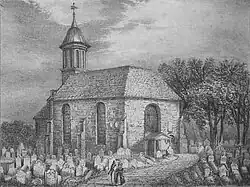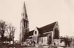 ![]() Saint Mary's Church from the southeast, showing the older tower and spire with the rebuilt body of the church | |