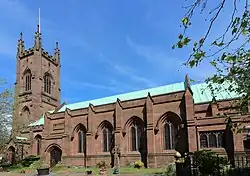 St Mary's was originally the parish church of the Hundred of West Derby and of the area containing what was to become the city of Liverpool.[4] A church on the site is mentioned in the Domesday Book; this was rebuilt in 1326. The nave was rebuilt in 1741, followed by the chancel in 1810.[5] None of this has survived, the oldest part of the present church being the west tower, which was built in 1829–32 to a design by John Broadbent, a pupil of Thomas Rickman. The north side of the church was remodelled in 1840, and the chancel was rebuilt in 1843. In 1911 a south aisle, incorporating a chapel, an ambulatory, and a vestry were added by Nagington and Shennan.[6] Most of the church, apart from the tower, was destroyed by incendiary bombs in the May Blitz of 1941.[7] The body of the church was rebuilt between 1947 and 1953 by Quiggin and Gee, retaining the exterior as before, but creating a new interior.[8] It is now open to visitors to allow them to view aspects of the church that date back to the Norman era.[9]