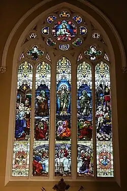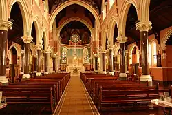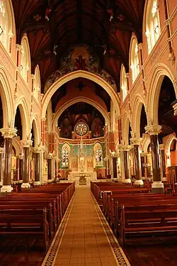 St Mary's contains four side chapels in addition to the main altar. The sanctuary is flanked by a pair of chapels, dedicated to the Sacred Heart (south) and the Blessed Virgin Mary (north). Flanking these large chapels are two smaller chapels, which front the transepts, dedicated to Saints of Ireland (south) and Saint Joseph (north). All four chapels and the sanctuary, terminate in semi-octagonal forms.