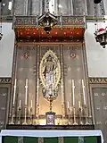 The interior has a continuous, stenciled waggon ceiling covering both nave and chancel. The high altar in the chancel is surmounted by a stenciled reredos depicting the Risen Christ with seven lamps hanging above. There is also a threefold Sedilia in the south wall of the Sanctuary. The north chapel has a stone quadripartite ribbed vaulted ceiling and an Easter Sepulchre. The South Aisle contains the organ and a side chapel at the east end, a Calvary Scene and a shrine of Our Lady of Walsingham. A set of fourteen Stations of the Cross surround the nave in both the north and south aisles. At the west end there is a Font with an intricate 19th century cover. Since 2015 the Church has hosted a contemporary art installation behind the font by the Royal Academy's Maciej Urbanek. The Work, titled 'HS', presents an abstract and subversive take on the classic image of the Holy Spirit descending as beams of light. It won the 2015 ACE Award for Art in a Religious Context.[3] The church is Grade II* listed, for its interior.[4]
