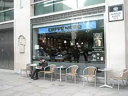 Along with the majority of the parish churches in the City, St Michael-le-Querne was destroyed by the Great Fire in 1666. A Rebuilding Act was passed in 1670, and a committee set up under Sir Christopher Wren, decided to rebuild 51 of the churches.[7] St Michael's was not among them. Instead the parish was united with that of St Vedast Foster Lane. The site of the church was cleared to allow for the widening of Cheapside, although Richard Newcourt noted that "some small part of one Corner of the Steeple, was for Ornament and Uniformity, added to the Houses there built."[6]