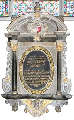 In February 1646 the bell tower was blown up in the Battle of Torrington, a battle of the First English Civil War. The Royalists who held the town had stored some 80 barrels of gunpowder in the church. The Parliamentarians as they captured the town shut their prisoners in the church and somehow the powder was detonated with great loss of life. The blast is believed to have come from the south transept (the old tower) in a north-westerly direction, destroying several pillars and the fire that followed destroyed old furnishings and monuments.[2][3] The church had to be rebuilt and this was completed in 1651.[4][5]