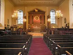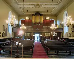 The interior is a single space, undivided by piers or columns. The eastern third was originally marked out as a chancel by means of the floor being raised by one step. The level was raised further during alterations by William Butterfield in 1871–72. The church was built without galleries, but they were soon added on three sides. Hardwick included them in his rebuilding, and the western one remains today.[4]