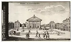 In 1630, the 4th Earl of Bedford was given permission to demolish buildings on an area of land he owned north of the Strand, and redevelop it. The result was the Covent Garden Piazza, the first formal square in London. The new buildings were classical in character. At the west end was a church, linked to two identical houses. The south side was left open.[3]
