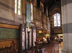 The interior features rich colours and strident colour contrasts, characteristic of Butterfield's work, compared to the exterior. All the stonework is constructed of the Waurn Ponds limestone with contrasting stripes of the very dark-coloured local bluestone. The dado, floor, high altar and reredos are outstanding examples of High Victorian Gothic polychromy. The reredos is made from Devonshire marble, alabaster and glittering Venetian glass mosaics. One of the carved figures on the pulpit is said to be the image of a former Mayor of Melbourne's daughter who died in infancy. The floor is entirely paved with encaustic tile imported from the English firm of Maw & Co., featuring both patterned layouts and patterns within the tiles, while the dado is created with patterned glazed tiles.