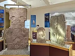 The museum displays 38 carved stones which formerly stood upon the old church mound. Among the stones on display is the 9th-century Drosten Stone, a flat rectangular slab with a cross carved on one side and Pictish symbols on the other, and also bearing a Pictish inscription in Latin script.[1] The museum is managed by Historic Scotland and is housed in two adjoining sandstone cottages close to the church. The 19th-century cottages are a category B listed building.[2]