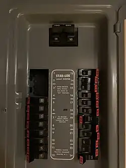 Stab-Lok is a brand name of electrical circuit breakers that were manufactured primarily by Federal Pacific Electric from 1950 to 1980.[1][2] In June 1980, Reliance Electric, which had purchased FPE, reported to the United States Consumer Product Safety Commission that "many FPE circuit breakers did not fully comply with Underwriters Laboratories, Inc. (UL) requirements. Commission testing confirmed that these breakers fail certain UL calibration test requirements."[3] In 2018 it was reported that Stab-Lok breakers and panels, made by FPE and other companies, were still in use, and it was recommended that they be removed as a potential fire hazard.[4]