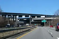 One of the first four-level stack interchanges in the northeastern United States was constructed in the late 1960s over I-84 in Farmington, Connecticut, for the controversial I-291 beltway around the city of Hartford. Most of the I‑291 beltway was later cancelled, and the sprawling stack lay dormant for almost 25 years. In 1992 the extension of Connecticut Route 9 to I-84 used the I‑291 right-of-way and some sections of the abandoned interchange. Several ramps still remain unused, including abandoned roadbed for I-291 both north and south of the complex.