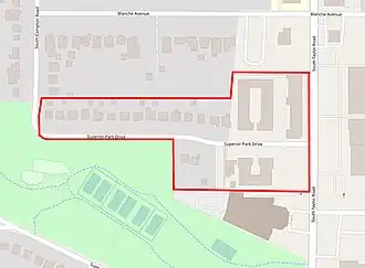 The Superior Park Development Co. purchased Roseman's 32 home sites on Superior Park Drive in March 1926.[20] The company cut a dirt road, Superior Park Drive, through the center of the tract (connecting Taylor Road and Compton Road)[21][18] in the winter of 1925-1926,[17][13] and constructed electricity, fresh water, natural gas, and sewer lines to the subdivision at his own expense.[13][21]