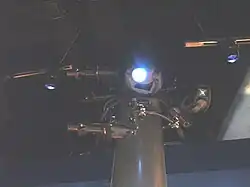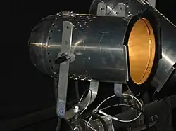 A beam projector is a lensless instrument with very little beam spread.[25] It uses two reflectors. The primary reflector is a parabolic reflector and the secondary reflector is a spherical reflector. The parabolic reflector directs the light into nearly parallel beams, and the spherical reflector is placed in front of the lamp to reflect light from the lamp back to the parabolic reflector, which reduces spill. The result is an intense shaft of light that cannot be easily controlled or modified. The beam projector no longer is used to the extent that it once was, as newer fixtures and PAR lamps have created easier ways to produce the effect.[26]