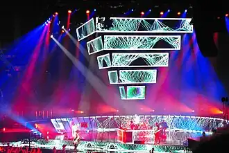 Stageco designs and builds custom-made as well as standardised concert stages, temporary structures for all kind of events as well as supplying PA structures, sport and delay towers, event scaffolding, roof structures, hydraulic lifts and platforms and grandstand structures.[3] Examples of their work include touring stages for Coldplay,[4] Muse,[5] and U2's 360 Tour.[6] In 2010 Stageco created the double configuration stage at Download for AC/DC and bespoke temporary event structure The Drum for the Middle East Gas celebrations organised by WRG for the 77 Mta Task Force.[7][8] The company also provide stages for a variety of festivals including 11 stages for Lowlands Festival,[9] and a wide variety of high end fashion shows, including for French designer Sonia Rykiel.[10]