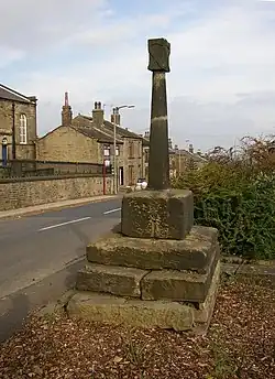 On the roadside across from St Andrew's Church stands the Stainland Cross, relocated here in the twentieth century. It represents a saltire carved on a block of stone. The block is scooped out in the form of a cup but the cover that was formerly attached to it has been removed. The column is circular and plain without any of that rich, strange sculpture or scroll ornament which antiquarians generally attribute to Saxon or Danish sculptures. Its height from the base to the top of the sculpture is about 10 feet (3.0 m), the column doesn't exceed 5 feet (1.5 m). Neither history nor tradition have preserved the date or purpose of its construction.