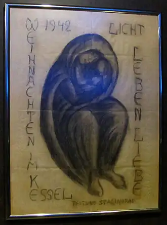 The drawing and Reuber's letters were published shortly after the war, and Navy chaplain Arno Pötzsch wrote an apologetic book of poetry entitled The Madonna of Stalingrad in 1946.[5] The work became a powerful symbol of peace in the Cold War era, as well as part of the mythologising of Stalingrad and the events of the Second World War in German society.[6] Copies were presented, and are displayed, in the cathedrals of Volgograd (formerly Stalingrad), Berlin, and Coventry as a symbol of reconciliation. Similarly a Cross of Nails from Coventry is displayed with the Madonna in the Kaiser Wilhelm Memorial Church.