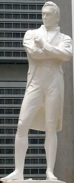 While Raffles was largely credited for the founding of contemporary Singapore, the early running of day-to-day operations was mostly done by William Farquhar, who served as the first Resident of Singapore from 1819 to 1823.[5] Raffles soon returned to England in 1824, where he died on his birthday in 1826 at the age of 45. His legacy while complex remains significant in Singapore, most notably the Raffles's Landing Site, as well as his name being a common sight in numerous entities and institutions throughout the country.