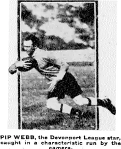 New Zealand departed for Sydney on 3 July on board the Moeraki.[22] Webb made 6 appearances on the tour with 5 at halfback and 1 against New South Wales late in the tour at centre. He played in the opening match of the tour against New South Wales on 11 July at the Sydney Cricket Ground. New Zealand lost before a crowd of 24,000 by 7 points to 4. Webb was playing alongside his Devonport clubmate Bert Laing who was captaining the side in the standoff position.[23] New Zealand were said to be the better side but wasted several scoring chances through poor handling. It was said surprisingly that Laing and Webb “had no understanding” with each other with Laing's handling being slow and bad. Webb “still has the old mode of putting the ball in the scrum, throwing downward. The recognised style here now… is for the ball to be slung in almost horizontally or delivered at least lower than the knee”.[24] Webb then played against the Australian Universities side at the Sydney Sports Ground before 2,500 spectators. New Zealand lost 15–13 with Webb scoring New Zealand's last try which failed to be converted by Craddock Dufty thus costing New Zealand a chance of a draw.[25] Earlier he had sent a smart pass to Maurice Wetherill who scored New Zealand's first try which was converted by Neil Mouat to give New Zealand a 5–0 lead.[26] Webb was replaced at halfback for the 3rd tour match against Newcastle by Wilson Hall with The New Zealand Herald reporting “Webb played a fine game at halfback against New South Wales, and it is hard to understand why Wilson-Hall is selected instead of him”.[27] Webb missed selection for 2 further matches against New South Wales before returning to the side for their 6th tour match against Far North Coast on 29 July. The match was played in Lismore before 5,000 spectators. New Zealand won 21–20.[28] He was said to be “smart at clearing the ball from the scrums”.[29] On 5 August he played against Ipswich on North Ipswich Reserve with New Zealand losing 22–21.[30] He helped set up a try for Frank Henry when he passed the ball to him ten yards out and he crossed for a try which Craddock Dufty converted to narrow the score to 14–13 to Ipswich. The Brisbane Courier reported that Webb “is a new player, who is very tricky and speedy” and that he was “the finest of the inside backs. He was always dangerous, and took slices out of the defence by pace and trickiness when he was given the slightest chance”.[31] Webb was not selected for the next 2 matches but was chosen to play centre against New South Wales on 15 August. New Zealand won the match 19–18 at the Sydney Cricket Ground before 16,000 spectators. In the first half Wetherill was playing behind the scrum but in the second Webb moved into the half back position. He scored New Zealand's final try after Mouatt passed to him during “loose play” and Webb “scored easily”.[32] The try was converted by Mouatt giving New Zealand a 19–13 lead which they hung on to.[33] In the final match of the tour Webb moved back into the half back position for New Zealand's 26–25 loss to the Southern Division at Fisher Park in Cootamundra. New Zealand had travelled 253 miles over night by train to reach the venue. New Zealand was on the wrong end of a 28-3 penalty count with several of the Southern Division's points coming from penalty shots at goal.[34] Webb crossed for a try in the second half after gathering the ball and “dummied several opponents, and scored near the posts”.[35] After the conversion New Zealand led 25 to 12.[36]