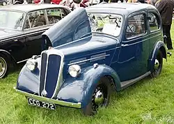 Behind the stylish rearward sloping radiator grill was a 1,131 cc side-valve engine, with a relatively long 100 mm (3.9 in) stroke and a 60 mm (2.4 in) bore.[2] The long stroke maximised the engine capacity available in the 9 HP tax class which, in the UK at that time, categorised cars and set annual car tax according to the diameter (bore) of the engine's cylinders. Maximum output was 30 bhp (22 kW) at the time of introduction.[3] The side-valve engine received an aluminium head, a single Zenith carburettor, and thermo-siphon cooling. Power was delivered to the rear wheels via a four-speed gearbox with synchronization on the top three gears.[4] By 1939, maximum power output had climbed to 33 bhp (25 kW) at 4,000 rpm.[5]