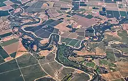 The lower Stanislaus River watershed comprises only about one-tenth of the total area and is used mainly for agriculture (61 percent) and urban development (34 percent), with minimal open space. Major communities near the lower river include (from upstream to downstream) Copperopolis, Knights Ferry, East Oakdale, Oakdale, Riverbank, Escalon, Salida and Ripon.[9] The 60-mile (97 km) long lower river has been modified extensively not only by water diversions, but by channelization and levee construction to drain wetlands and prevent floods. Most of the natural floodplain no longer exists, and about half of the former riparian habitat has been lost.[5] The river bed has been subjected to extensive gravel mining (mostly for construction purposes), with an estimated 6.3 million yd3 (4.8 million m3) extracted between 1939 and 1999.[20]