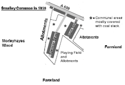 There is evidence of early coal extraction in the area: "in the High Yates Closes, a group of fields between Bell Lane and Smalley Common, Patrick Richardson, father of Samuel, took a lease of the coals in 1650 from Jacinth Sacheverell of Morley. The early Smalley coal workings extended further south along the higher ground to Smalley Common."[5] An entry in the Nottingham Road Bill of 1784 includes "the Cross Post upon Smalley Common, (probably at the site of the White Post Inn) in the County of Derby".[6] and in the same year the village is mentioned on the Smalley Common enclosure award map when there is also mention of the road being a turnpike at Smalley Common.[7] There is also mention of a working windmill in 1880 but no traces remain.[5]