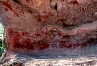 The rock art covering the walls of the Ship shelter shows ships from a number of nations, painted in red and white ochre on the red sandstone: sailing ships rigged in the distinctive styles of the European lugger and the Macassan (Indonesian) prau; a dugout canoe with a figure standing upright in it, hands outstretched. Some construe the images of European vessels with high sterns to be 16th or 17th century (Portuguese) ships, which is historically notable as the first reports of exploration of this coast to reach Europe are those from Captain James Cook's voyage aboard HMS Endeavour in 1770.