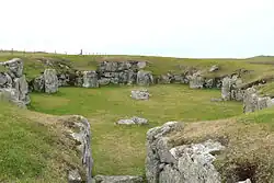 The smaller houses both have a large central space and some small rooms.[6] The main building is heel-shaped with a concave facade, as are other neolithic buildings in Shetland.[5] It has a shallow crescent-shaped forecourt.[7] An alcove outside the door may have been a guardroom.[8] The building is entered from the forecourt via a short, dog-legged passage.[7][8] The building's walls enclose an oval area about 40 by 22 feet (12.2 by 6.7 m) with six shallow recesses.[7]