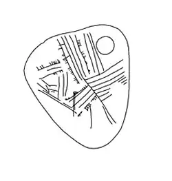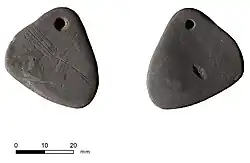 The pendant is sub-triangular in shape and measures 31 mm x 35 mm x 3 mm. ED-XRF (energy-dispersive X-ray fluorescence) was used to prove that it is made from shale. The front face is engraved with a series of parallel, incised lines which often cross each other. It has a perforation, made by drilling through from the engraved side at one of the lobes.[2]