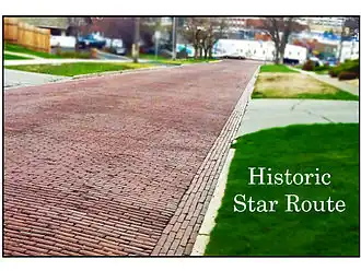 The Star Route and Palouse Street Brick Road, in Pullman, Washington, also known by the nickname Red Brick Roads are a block of NE Maple St. and a block of NE Palouse St. and together are the last remaining brick streets in the city. In the early 2010s, students in WSU's School of Design & Construction researched the history and significance of the brick roads.[2] The course project led to listings on the Pullman Register of Historic Places and the National Register of Historic Places in 2014.[3] The roads, paved in 1913, are important landmarks because of their connection with the Good Roads Movement. They made transportation easier along the only of the city's Star routes, providing an essential connection between the Northern Pacific Railroad depot and the growing campus of Washington State College (now known as Washington State University). The steepest part of the route to campus (which included the block of what is today NE Maple St. and NE Palouse St.) received brick paving to provide traction for horses and automobiles—particularly during the difficult winter months.