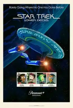 The series was promoted during the "Star Trek Universe" panel at the 2019 San Diego Comic-Con, where the main cast and first look images were revealed.[3] Further details were discussed at a panel specifically for Lower Decks at Star Trek Las Vegas 2019.[27] A trailer and poster were released in July 2020. Allie Gemmill of Collider called the trailer "a ton of fun and then some", comparing its adult-oriented tone to the series Rick and Morty which McMahan previously worked on.[51] This was followed by a "Star Trek Universe" panel at the 2020 Comic-Con@Home virtual convention where McMahan and the cast discussed the series and revealed its opening scene.[52] At the end of July, All Access released a new trailer celebrating "23 weeks of New Trek" and featuring footage from both the first season of Lower Decks and the third season of Discovery; the 23 weeks include both series, with Lower Decks premiering on August 6 and running for 10 weeks, followed the next week by the premiere of Discovery which then ran for 13 weeks.[53] Animation studio Titmouse released a shirt with a unique design on it alongside each episode of Lower Decks. The designs were only available for one week each. Fans who bought all ten designs received a bonus eleventh shirt.[54]