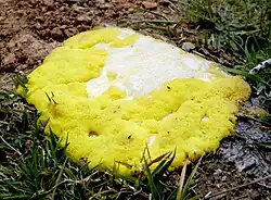 - Slime molds are possible causes, appearing suddenly, exhibiting a very gelatinous appearance at first and later changing to a dust-like form which is dispersed by rain and wind. The colours range from a striking pure white as in Enteridium lycoperdon, to pink as in Lycogala epidendrum, to purple, bright yellow, orange, and brown.