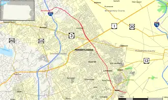 By 1940, U.S. Route 13 was routed along its current alignment, to follow MacDade Boulevard north past Main Street instead of joining it at the intersection.[16][17] U.S. Route 13 Bypass was also created by that year, splitting from U.S. 13 at the aforementioned intersection and heading northbound along Main Street and Lansdowne Avenue until what is now U.S. Route 1 (Township Line Road).[1][16] Here, it followed Township Line Road and later City Avenue into Philadelphia.[1][16] Township Line Road and City Avenue were signed as U.S. Route 1 Bypass, while the mainstem U.S. Route 1 followed Baltimore Pike into Philadelphia.[16] U.S. Route 13 Bypass was deleted in 1967.[18][19]