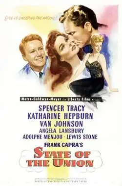 State of the Union is a 1948 American drama film directed by Frank Capra about a man's desire to run for the nomination as the Republican candidate for President, and the machinations of those around him. The New York Times described it as "a slick piece of screen satire...sharper in its knife-edged slicing at the hides of pachyderm schemers and connivers than was the original."[5] The film was written by Myles Connolly and Anthony Veiller and was based on the 1945 Russel Crouse, Howard Lindsay Pulitzer Prize-winning play of the same name.