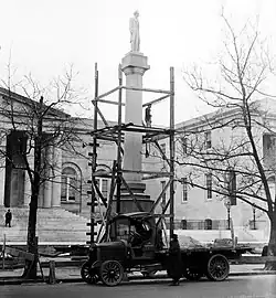 In 1919, the memorial was dismantled and placed in storage during the renovations of City Hall. Some of the city's residents and officials did not want the memorial reinstalled when renovations were complete since the much larger and grander Lincoln Memorial was already under construction.[1][2] Others thought the tall pedestal was unsafe.[7] When the public heard of the plans to leave the monument in storage, many were upset and groups such as the Grand Army of the Republic demanded the statue be reinstalled.[1] President Warren G. Harding even lobbied Congress on behalf of angry citizens.[7] Government officials conceded, but by that point, the statue was missing. It was later found in crates behind the Bureau of Engraving and Printing and cleaned. On June 21, 1922, an Act of Congress authorized the rededication, which took place April 15, 1923, 55 years after the initial dedication. When the statue was replaced, it was set on a new shorter base instead of the original column. An unexpected consequence of this was vandals having easy access to the statue. Lincoln's fingers were broken off several times, and his right hand had to be replaced.[1][2]