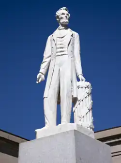 The marble statue is located on Indiana Avenue NW, in front of the old District of Columbia City Hall in the Judiciary Square neighborhood.[8] It measures 7.3 feet (2.2 m) high 2.9 feet (0.88 m) wide while the granite base measures 6.4 feet (2.0 m) high and 7 feet (2.1 m) wide. The statue portrays Abraham Lincoln standing, wearing a long coat with a bow tie and waistcoat. His left hand rests on a fasces while his right arm is by his side. Lincoln's partially open right hand points to the ground as he looks to his left. The right hand was replaced at some point, and the new one is considered too large to scale. A sword or scroll previously hung by his right side but is now missing. The two-tiered base consists of a rectangle on top of a lower square-shaped foundation.[2]