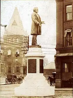The location of the statue was controversial. The committee initially proposed located it in Plymouth Park in the Third Ward, in the middle of Rochester's black community. However, local residents opposed it and other city residents wanted a more central location. The final decision was to erect it by the New York Central train station.[10] The initial unveiling was scheduled for September 14, 1898, but the organizers learned on September 12 that the statue was not ready. Regardless, almost 3,000 people gathered on September 14 to observe a ceremony in which the monument was formally turned over to the city.[12]: 82 In his speech, Mayor George E. Warner said: