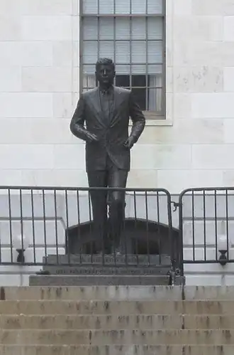 A statue of John F. Kennedy (sometimes called John F. Kennedy) by Isabel McIlvain is installed outside the Massachusetts State House in Boston, Massachusetts, United States.