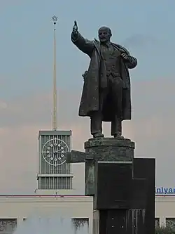 The statue, erected in 1926, is one of the first largescale statues of Lenin erected in the Soviet Union, though it is predated by one in Volgograd.[4] The statue depicts Lenin in the act of making a speech from atop the armoured car.[5] The statue was created in an early constructivist style by sculptor Sergei A. Evseev and architects Vladimir Shchuko and V.G. Gelfreich.[6][5] The figure is made of bronze while the plinth, representing the armoured car, is of stone.[7][5]
