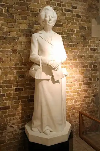 The statue of Margaret Thatcher in the Guildhall, London, is a marble sculpture of the former British Prime Minister, Margaret Thatcher. It was commissioned in 1998 by the sculptor Neil Simmons by the Speaker's Advisory Committee on Works of Art;[1] paid for by an anonymous donor, it was intended for a plinth among statues of former Prime Ministers of the United Kingdom in the Members' Lobby of the House of Commons. However, as the House did not permit a statue to be erected there during its subject's lifetime, the work had been temporarily housed in Guildhall.[2] It was unveiled there by Lady Thatcher in February 2002.[3][4]